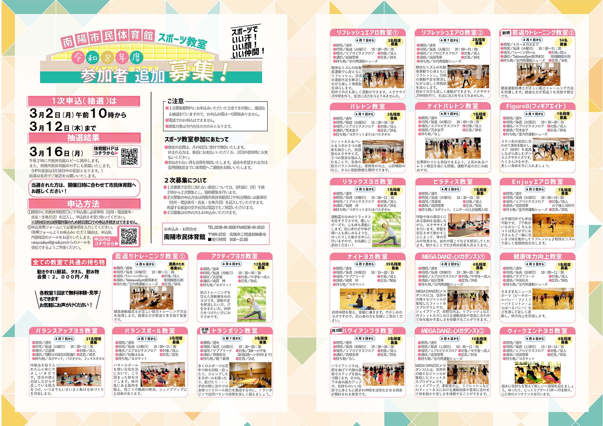 市民体育館(TEL:0238-49-2600)またはtaiikukan2@yahoo.co.jpまでお問い合わせください。