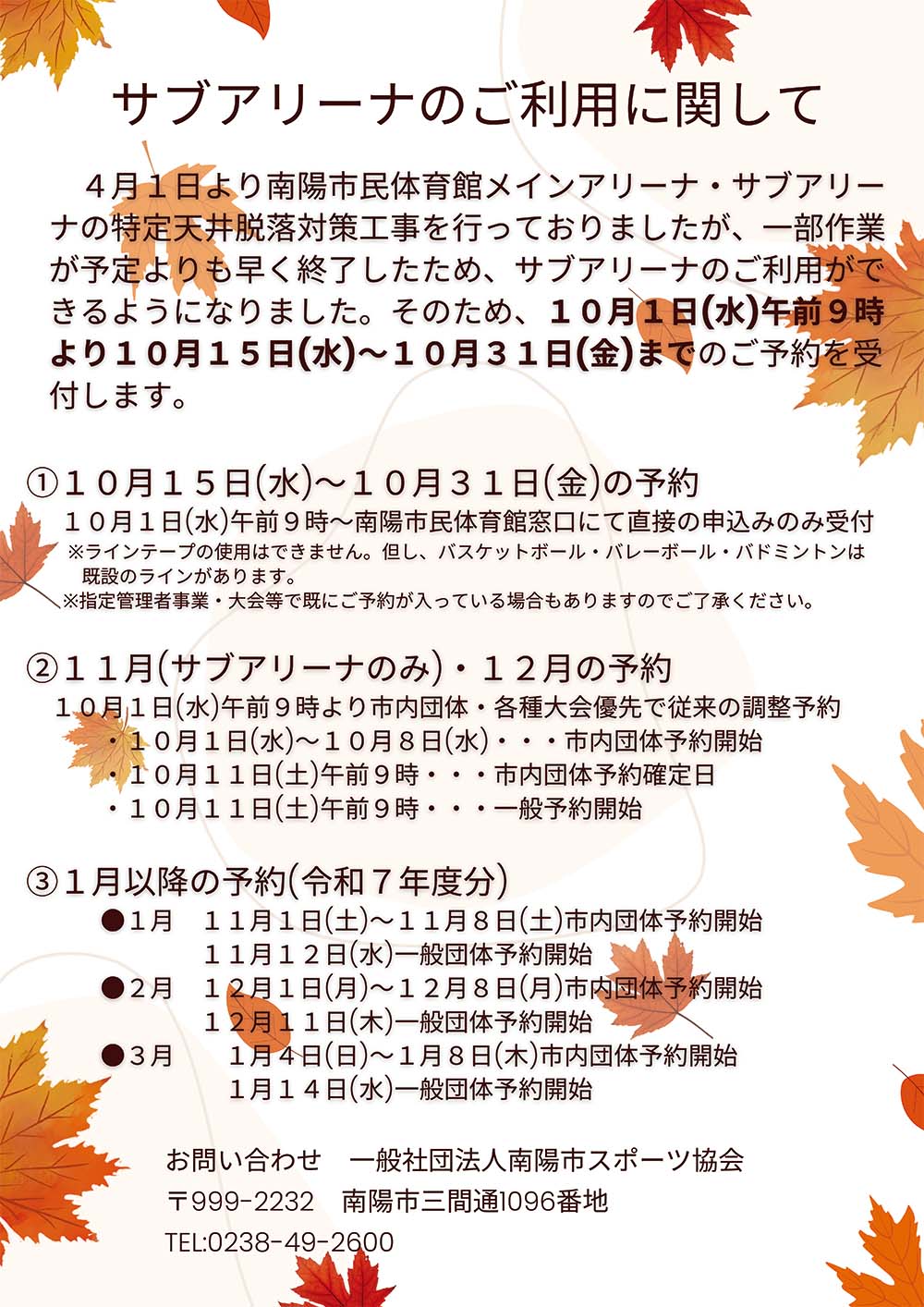 令和7年4月1日より行っている「特定天井脱落対策工事」が一部終了したため、サブアリーナのご利用ができるようになりました。ご利用開始日やご予約方法・ご利用にあたっては条件がございますのでチラシをご確認の上、ご予約ください。